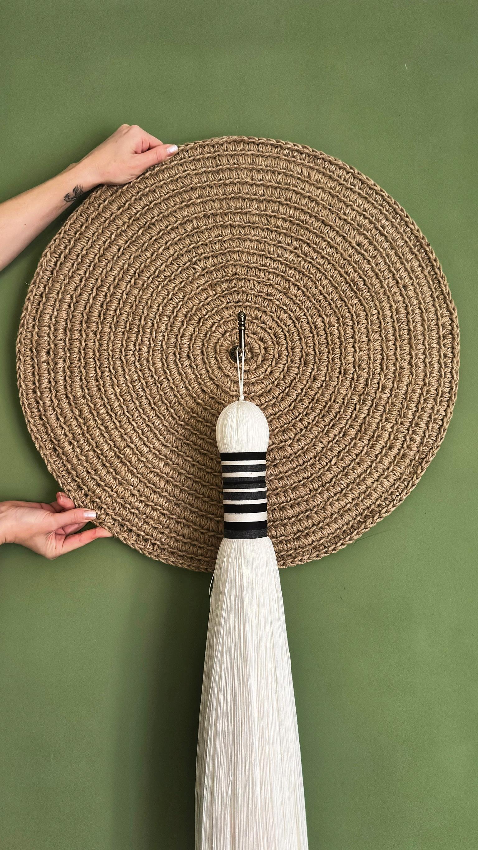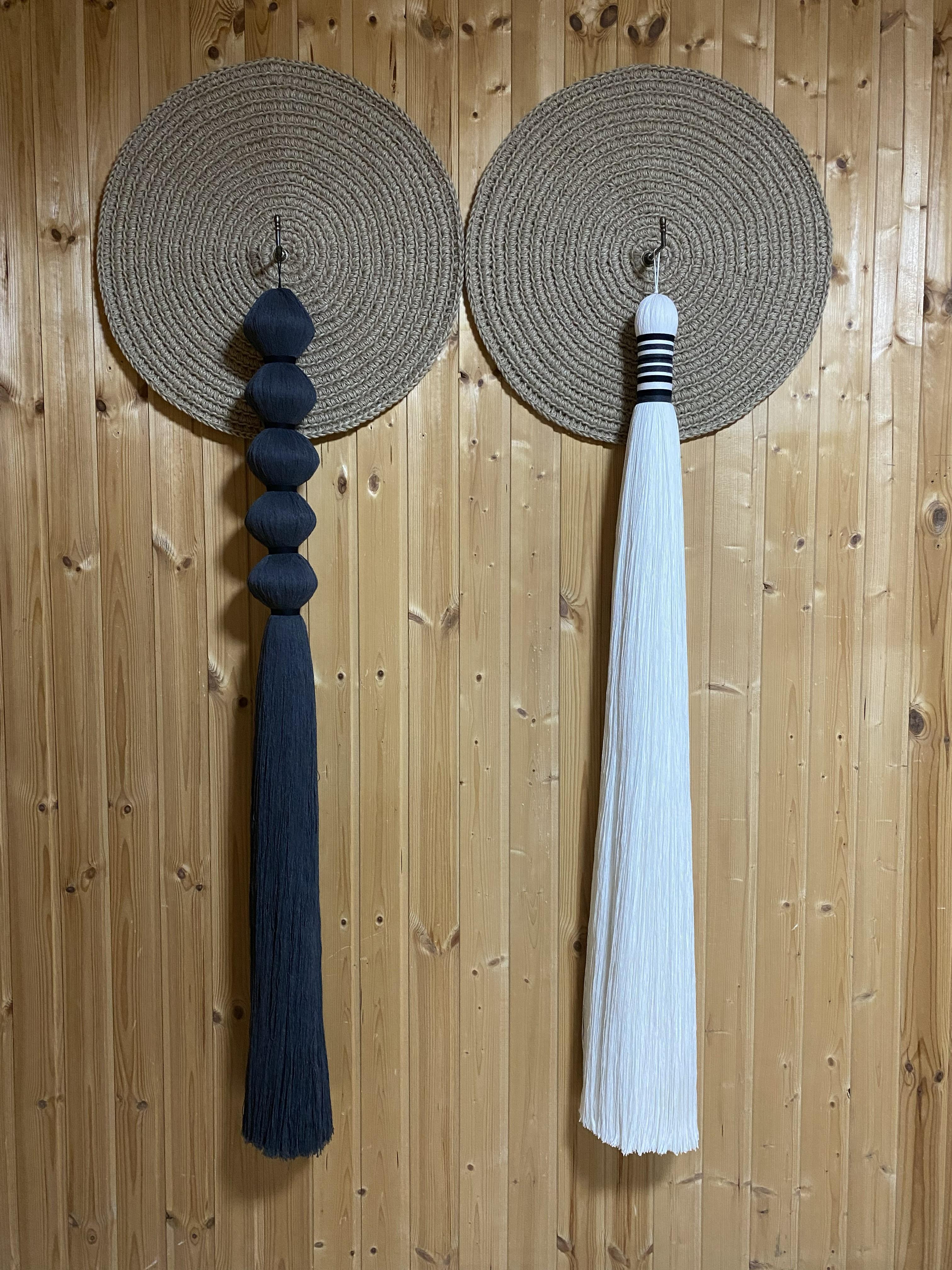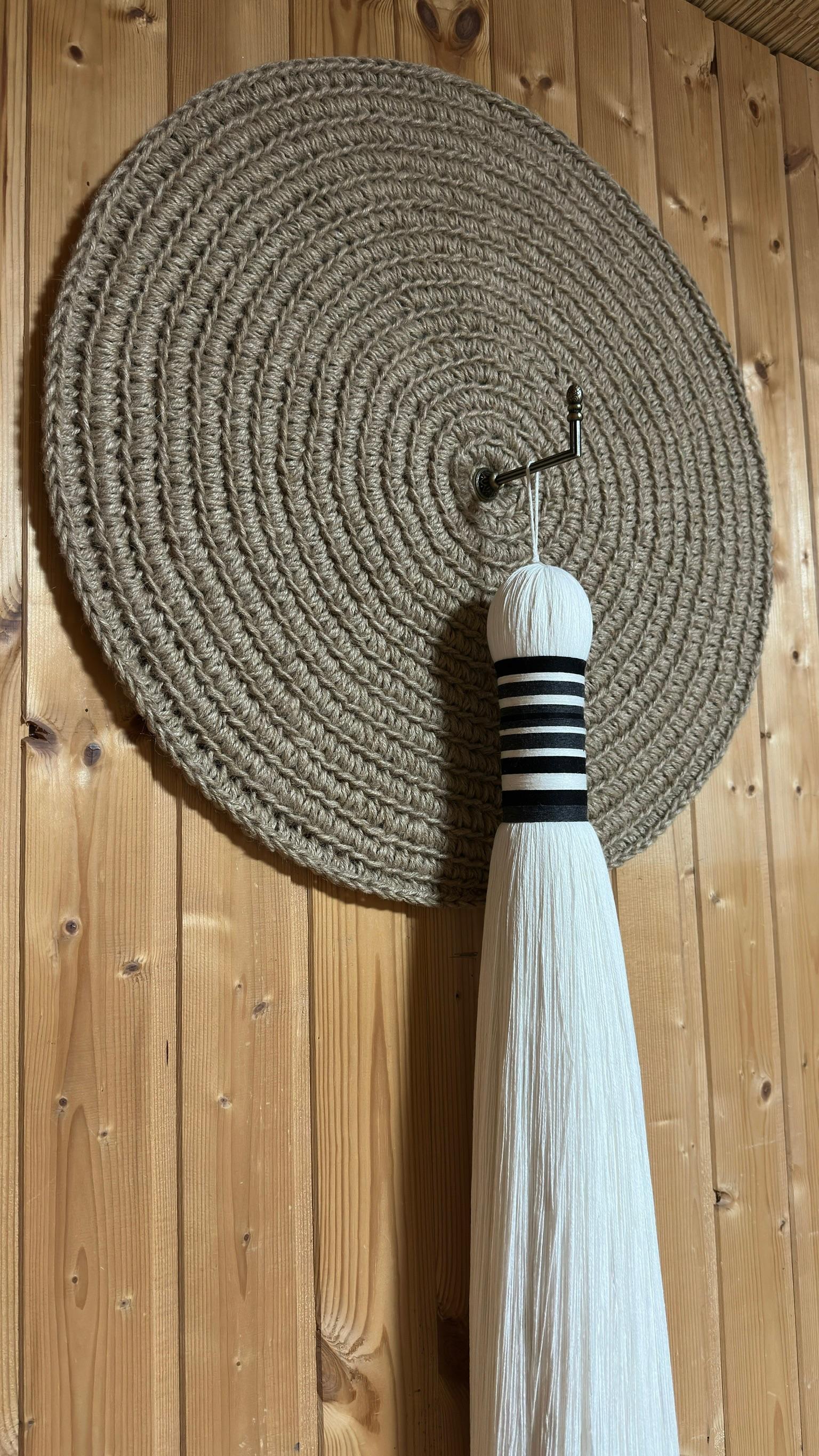 Панно Кисть Эти два панно выполнены на заказ. Диаметр круглых элементов 60см, материал джут. Кисти длинной 140см Круглые шары в темной кисточке диаметром 12см Материал: хлопковая нить. Цена панно со светлой кисточкой 14000 руб Цена панно с темной кисточкой 20 000 руб Можно изменить размер и расцветку Данная цена является ориентировочной, конечную стоимость изделия вы можете узнать после уточнения размеров, цвета, формы и материалов используемых при изготовлении. Данный товар изготавливается под заказ, может быть выполнено в другом цвете и размере, уточняйте.