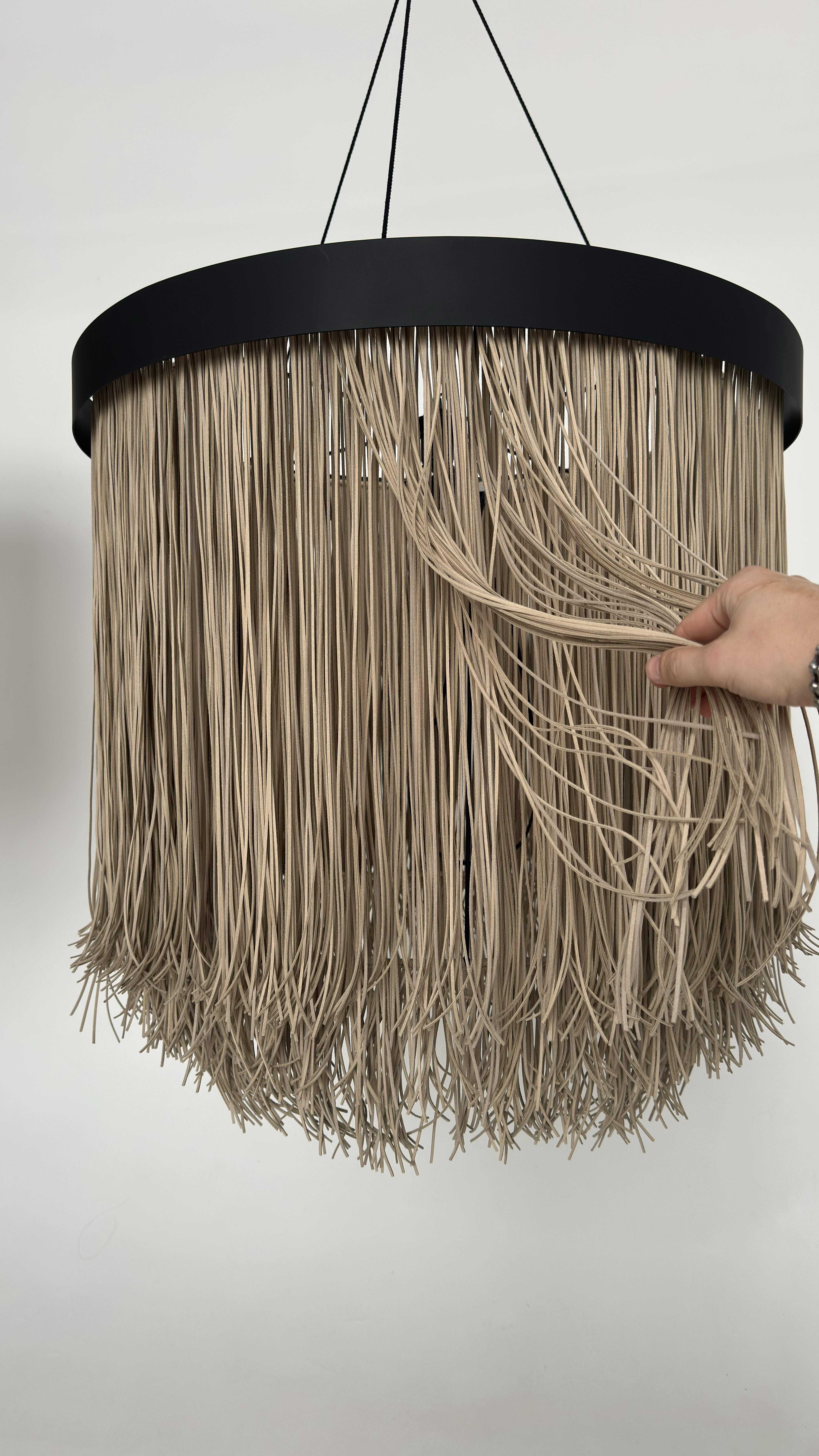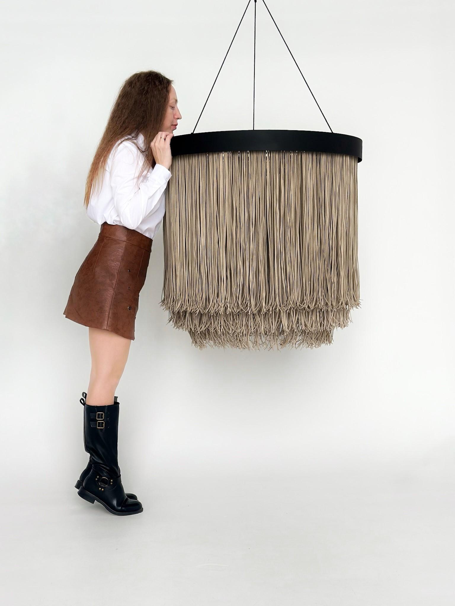 Абажур выполнен из замшевой экокожи. Диаметр 80см, высота 80см Три яруса бахромы Электрика на 3 лампочки Е27, потолочная чаша и эл.провод в комплекте Металический каркас с полосой 7см Абажур очень стильный Подойдет во многие интерьеры, особенно в стиль типа Шале. Выглядит ДОРОГО! За счет экокожи и эффекта замши. На данный момент являются полным эксклюзивом на нашем рынке. Данная цена является ориентировочной, конечную стоимость изделия вы можете узнать после уточнения размеров, цвета, формы и материалов используемых при изготовлении. Данный товар изготавливается под заказ, может быть выполнен в другом цвете и размере, уточняйте.