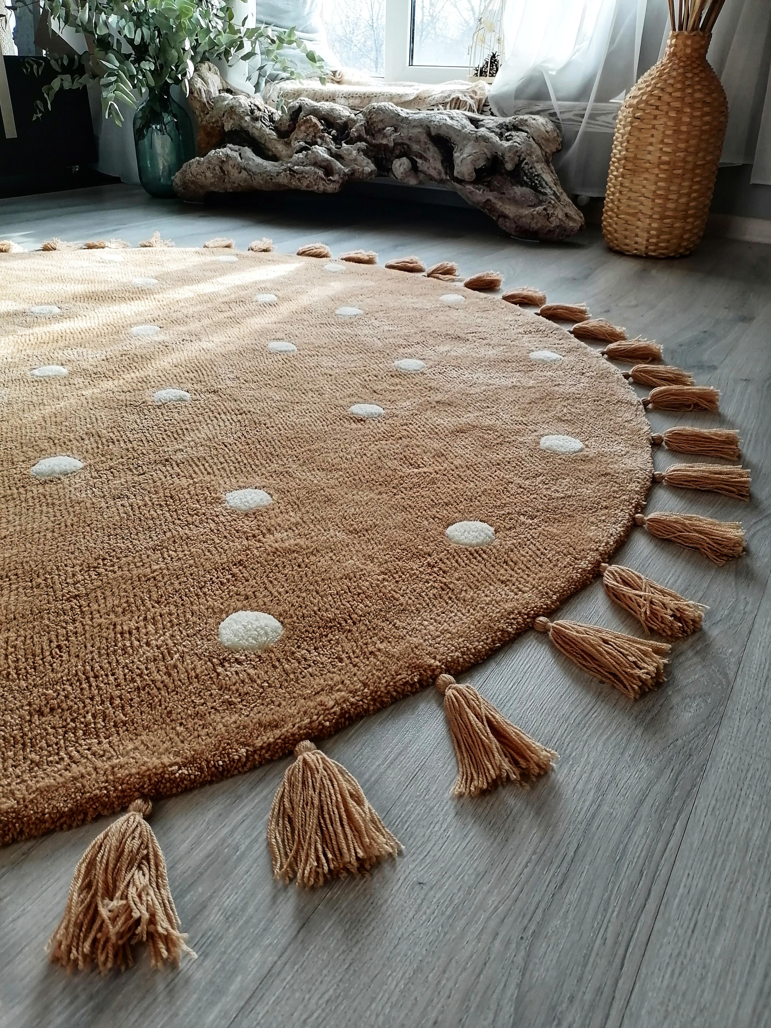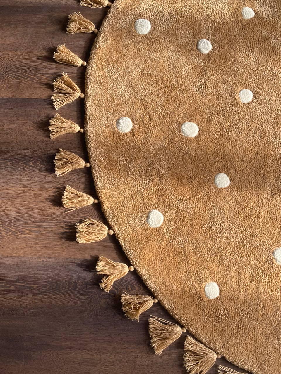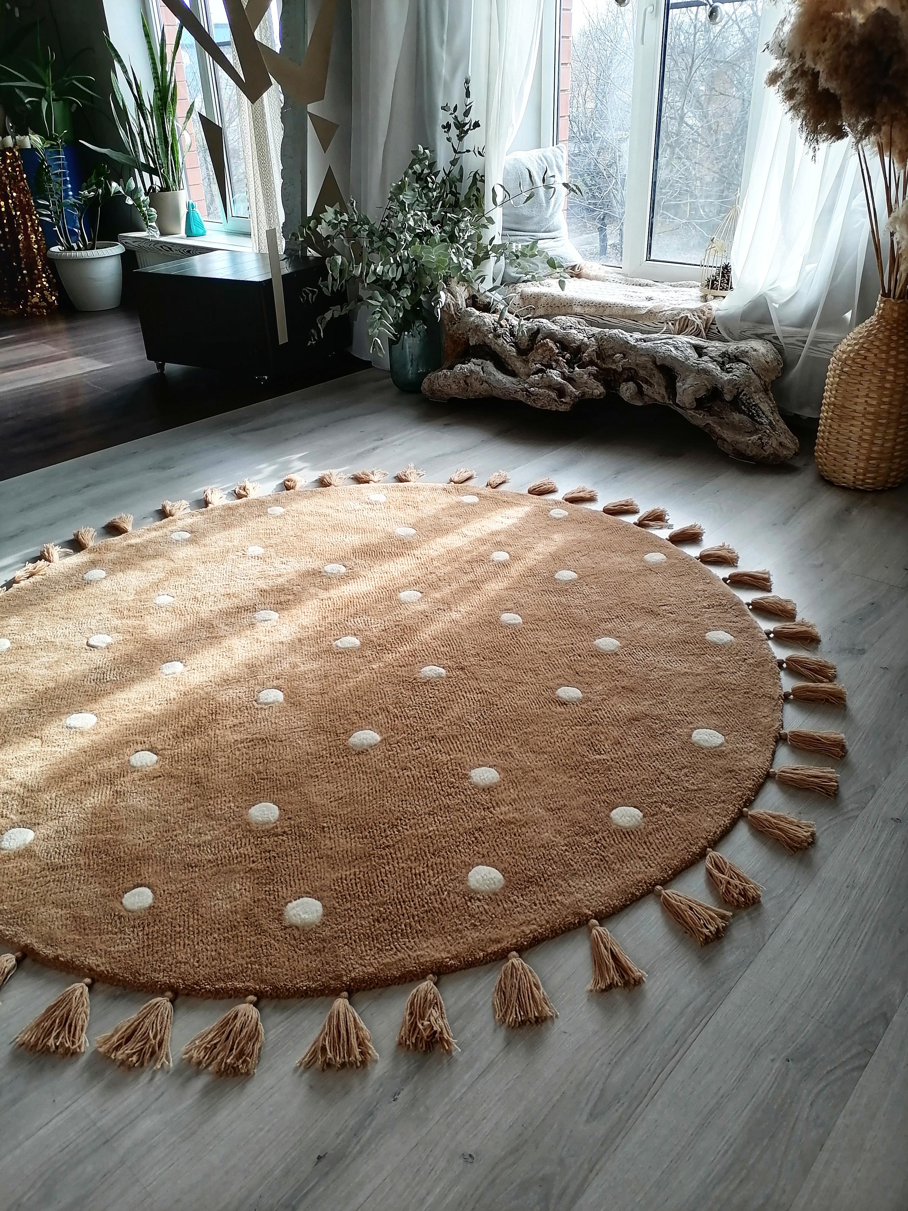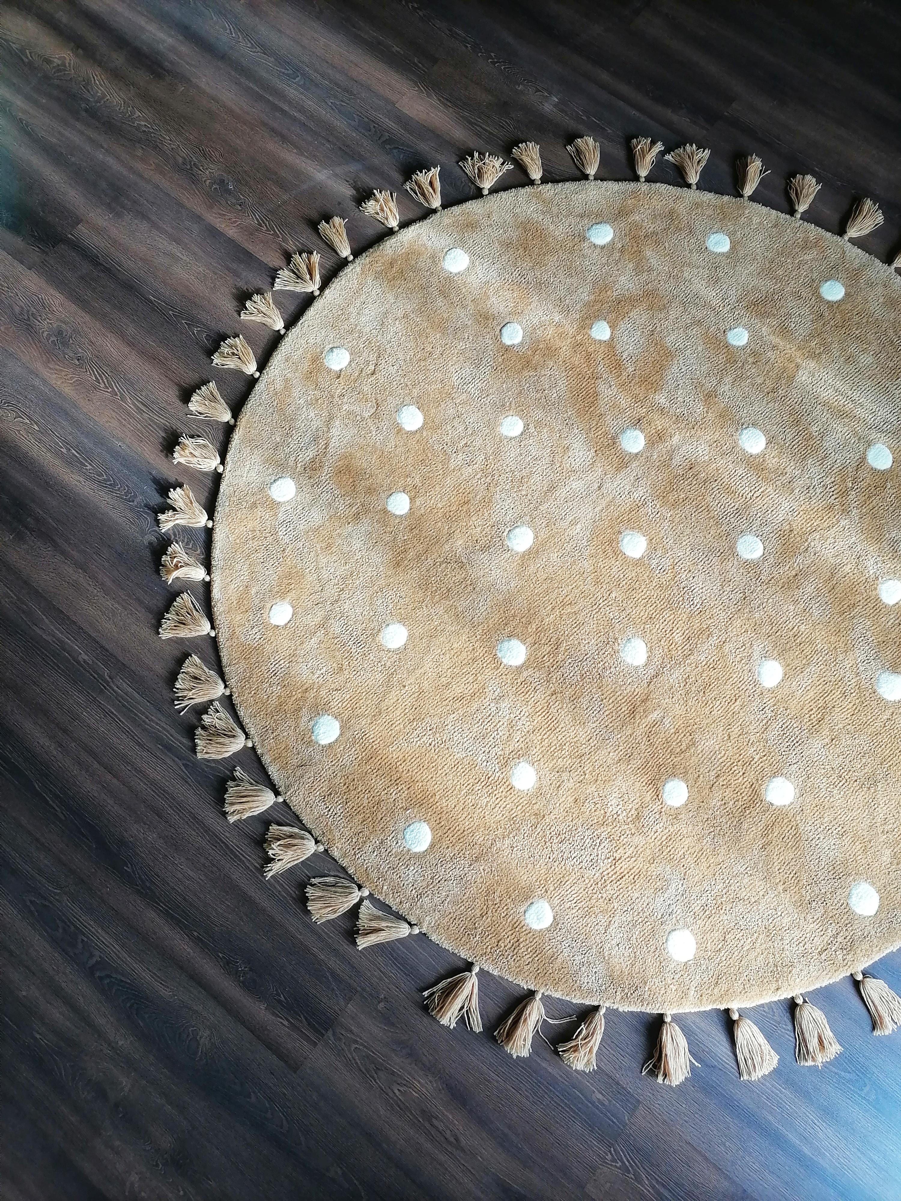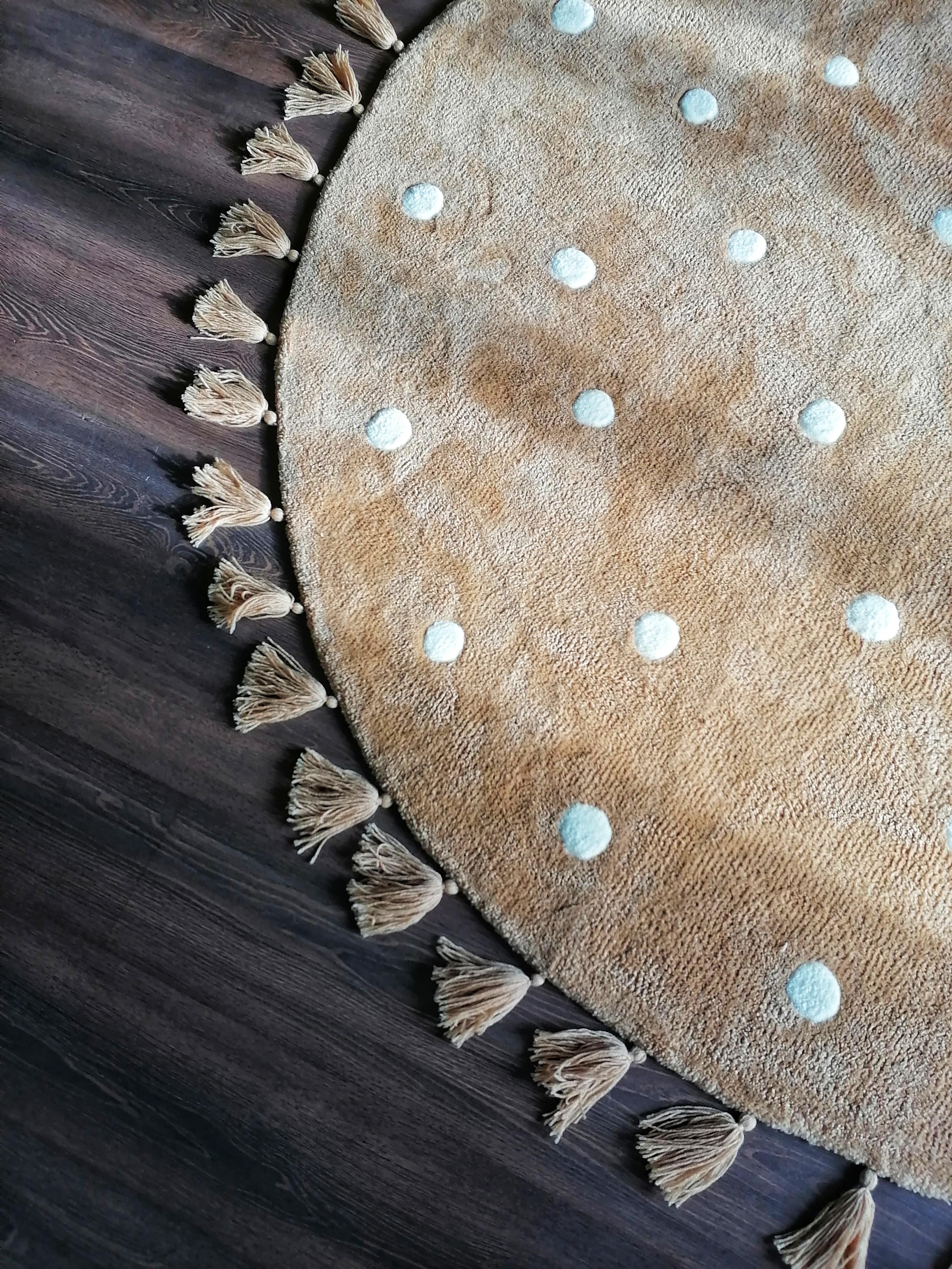 Ковёр выполнен в технике Тафтинг Матениал : шерсть 50%, акрил 50%. Очень мягкий, высота ворса 3см Выполнен на заказ Диаметр 2м Есть антискользящее покрытие, благодаря чему ковёр не скользит и можно не волноваться, что дети упадут, бега по нему. Белые круги слегка выпуклые и тем самым создают отличный массажный эффект, что очень хорошо для детской ножки. Цена указана за 1 кв.м Данная цена является ориентировочной, конечную стоимость изделия вы можете узнать после уточнения размеров, цвета, формы и материалов используемых при изготовлении. Данный товар изготавливается под заказ, может быть выполнен в другом цвете и размере, уточняйте.