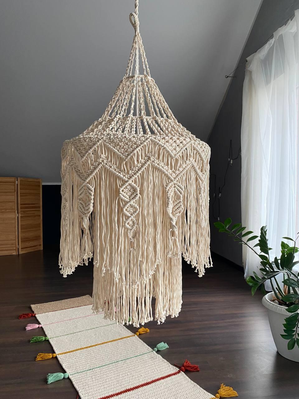 Макраме абажур, выполнен на заказ. Диаметр 50см, общая высота 85см Крепление под один патрон Е27 Материал: хлопковый шнур Данная цена является ориентировочной, за 1 единицу товара, конечную стоимость изделия вы можете узнать после уточнения размеров, цвета, формы и материалов используемых при изготовлении. Данный товар изготавливается под заказ, может быть выполнен в другом цвете и размере, уточняйте.